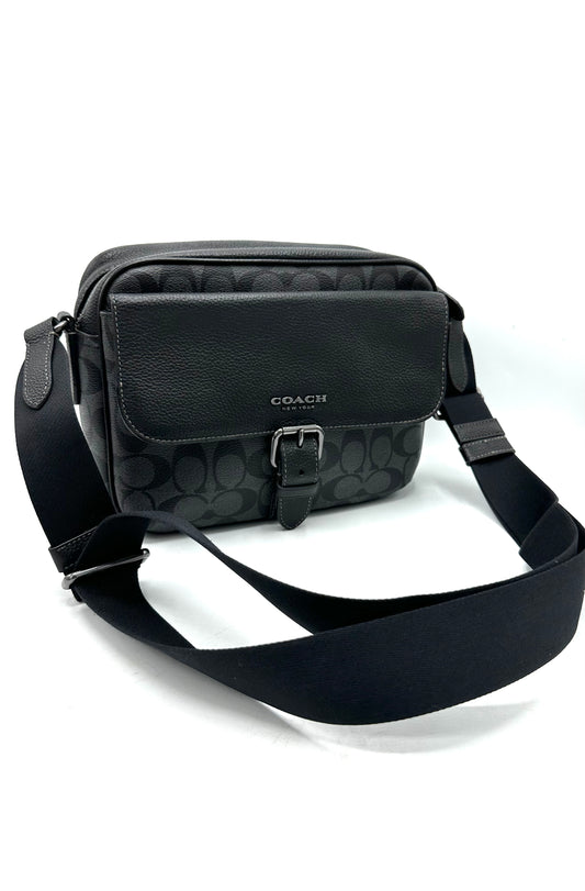 Coach Hudson Crossbody – Black Pebbled Leather & Grey Signature Coated Canvas