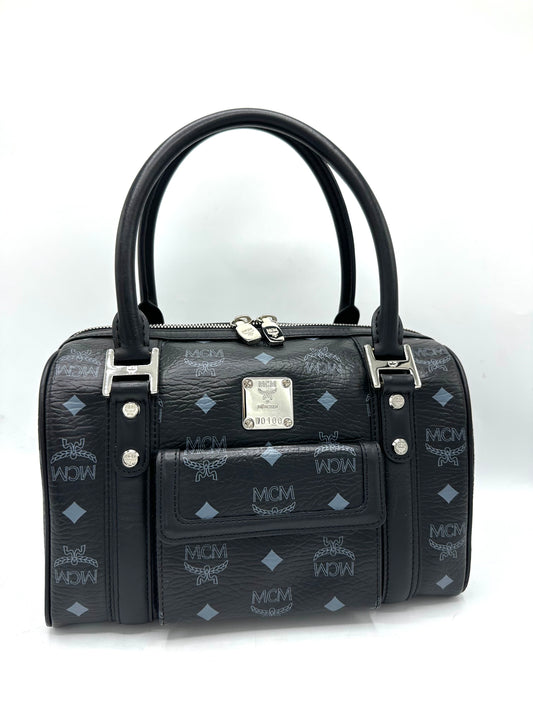 MCM Visetos Front Pocket Boston Bag – Black Leather with Silver-Tone Hardware