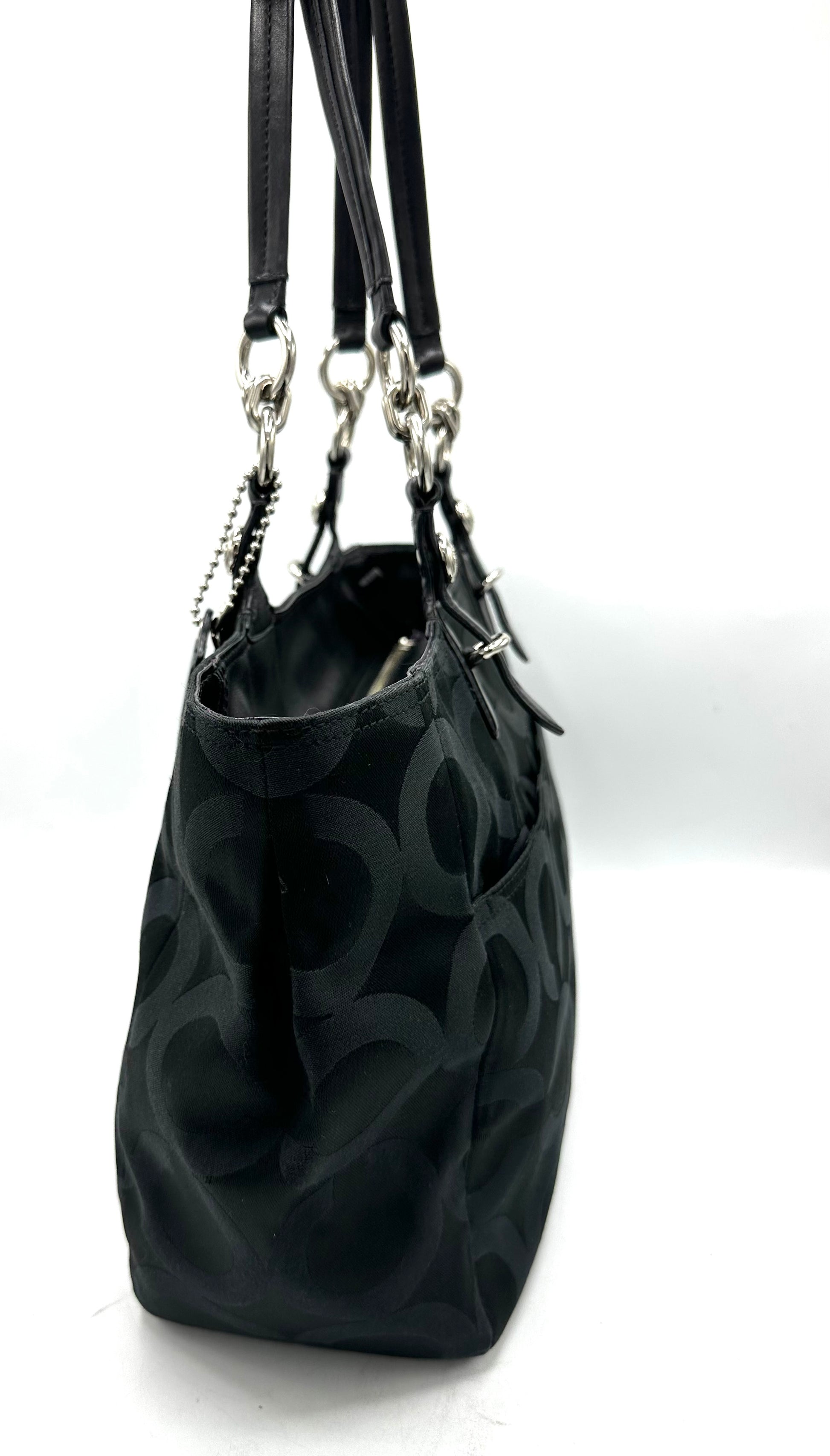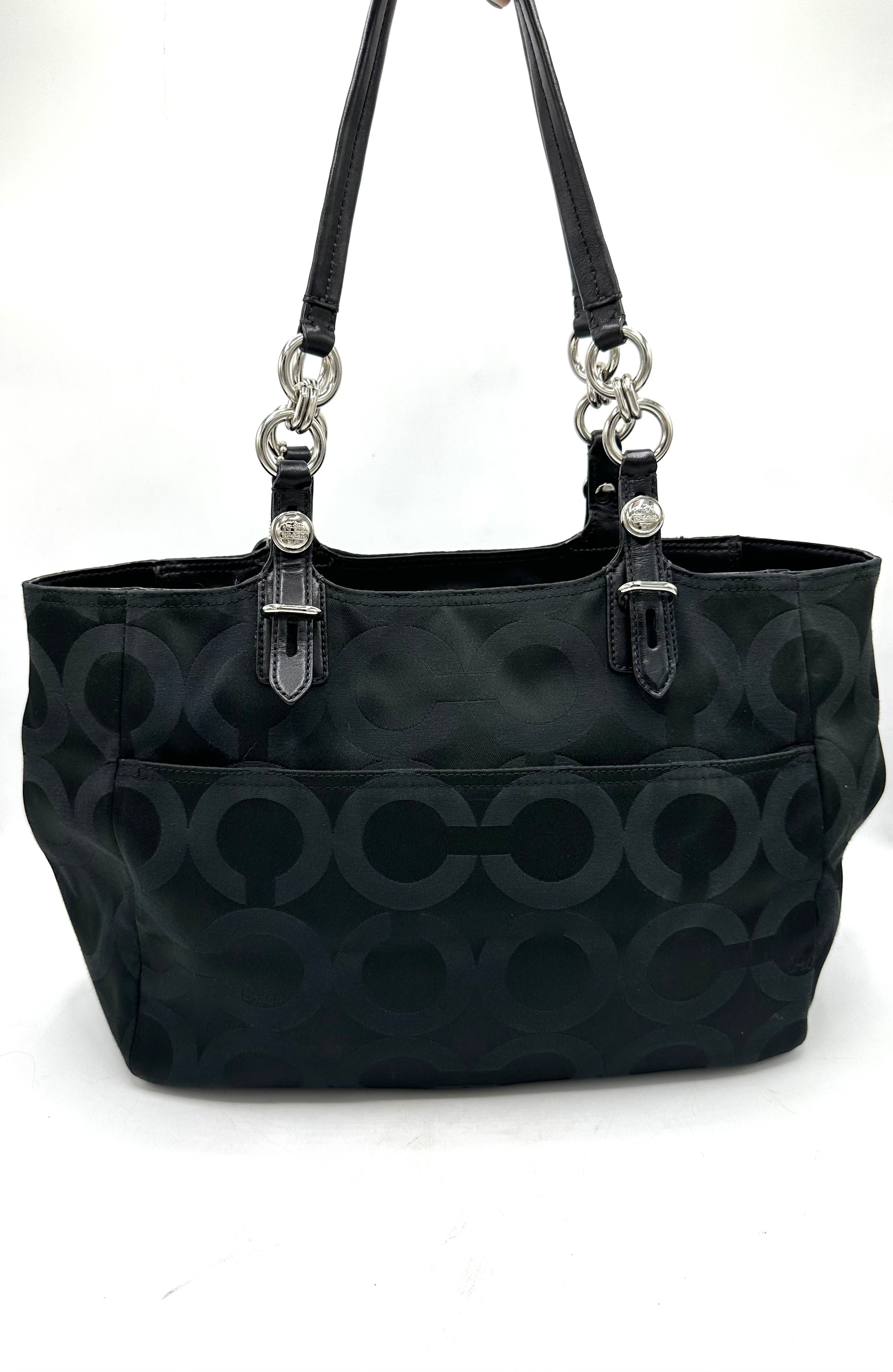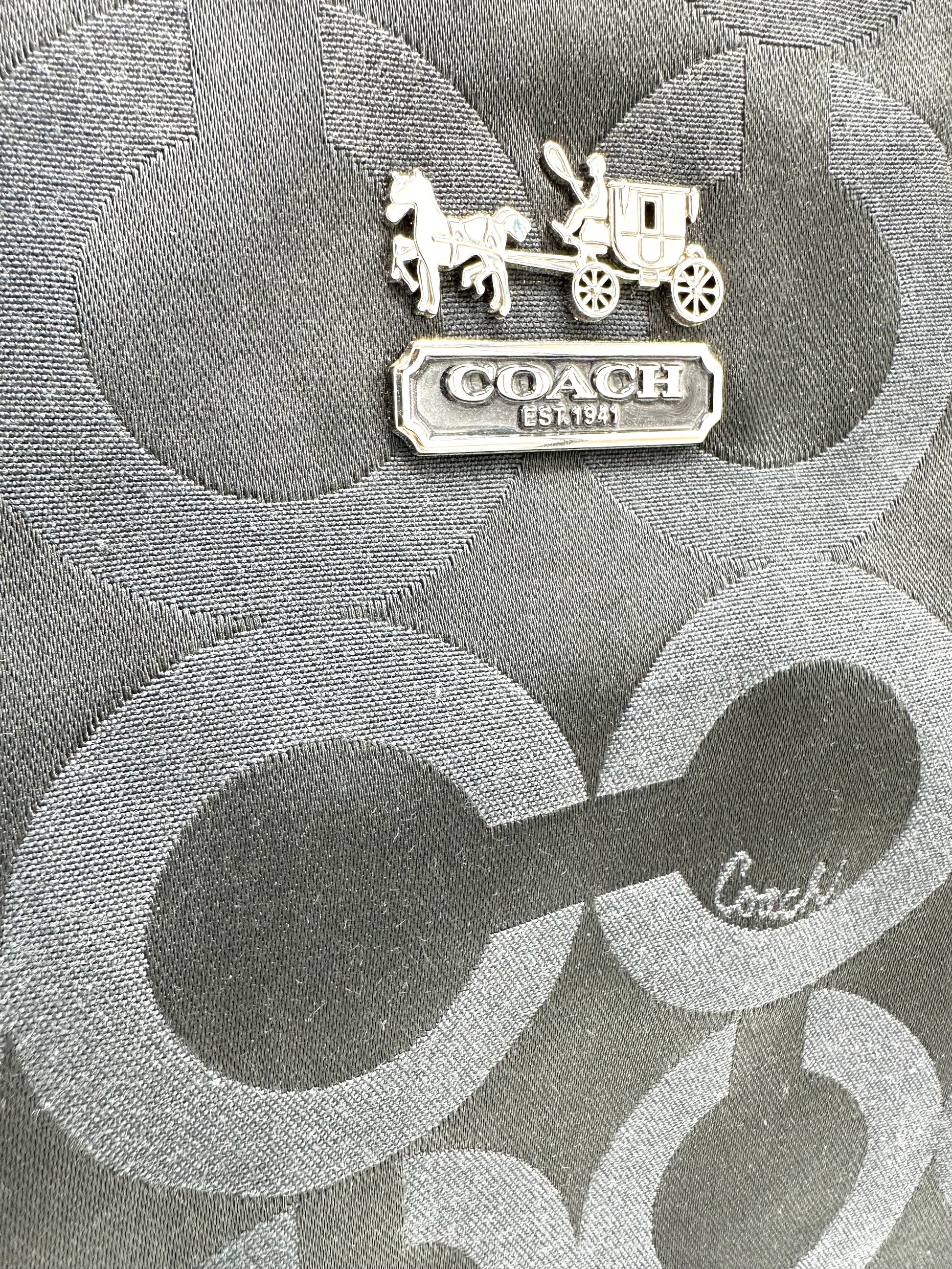 • Zip-top closure with Coach leather hangtag