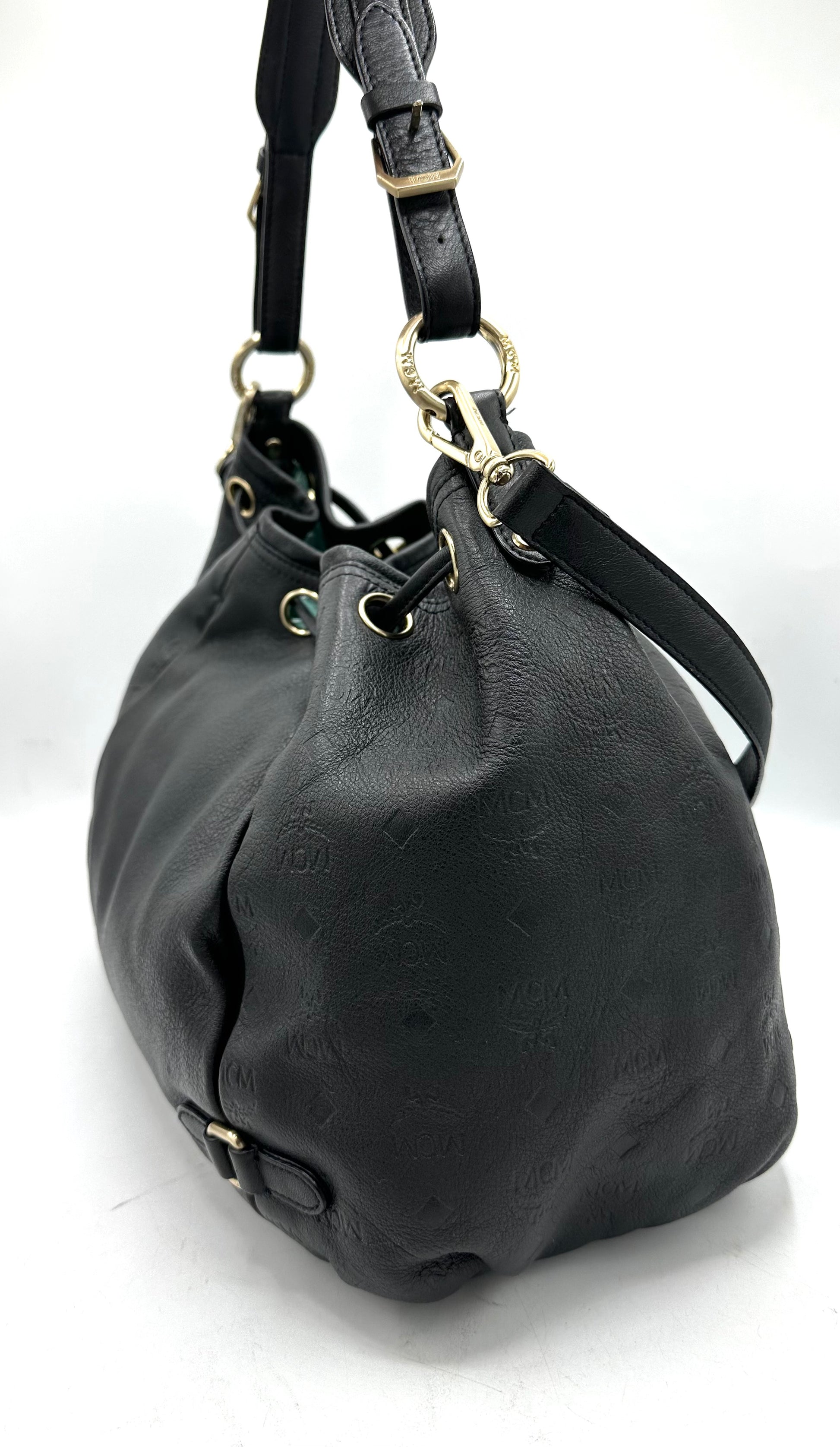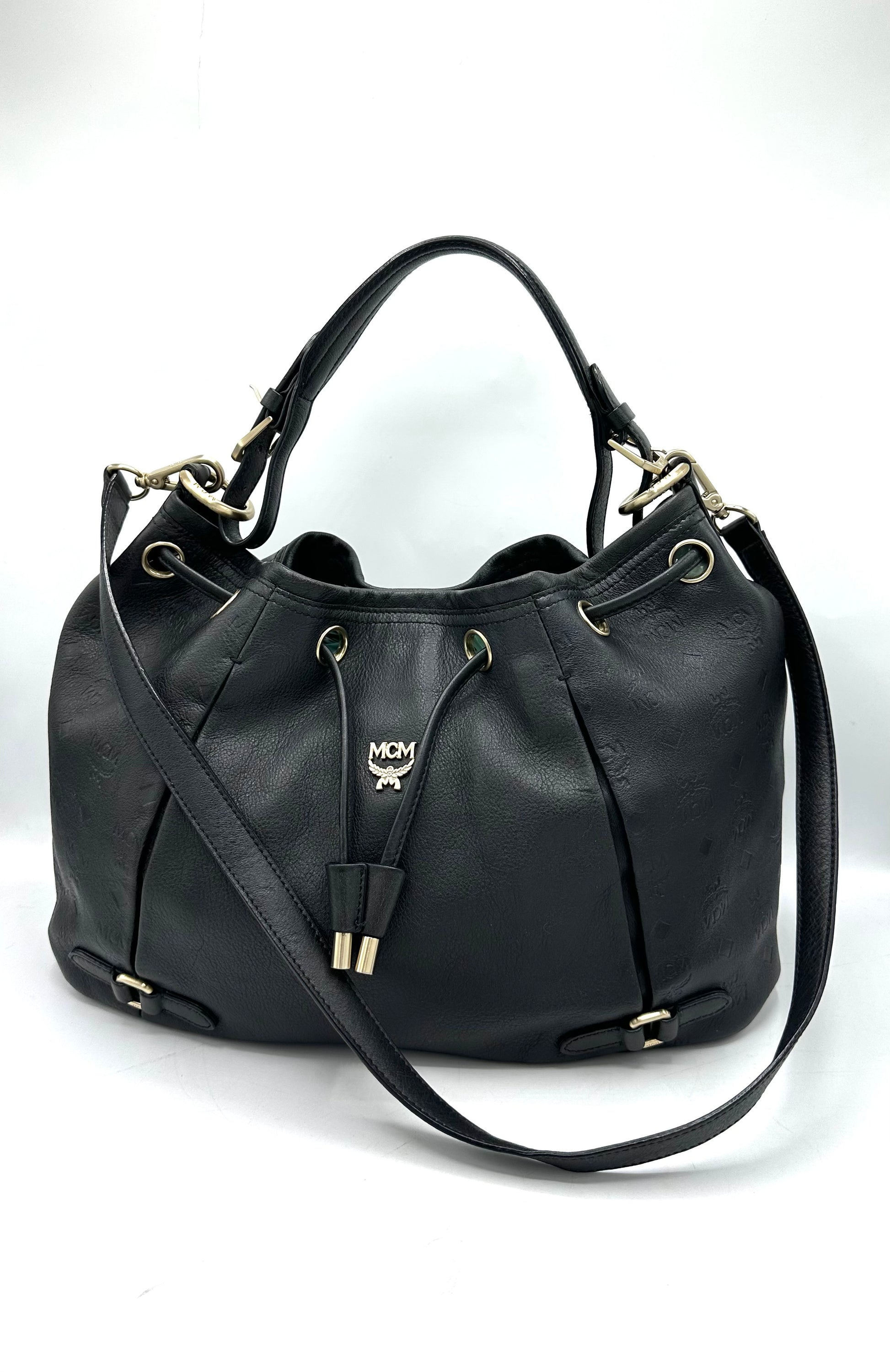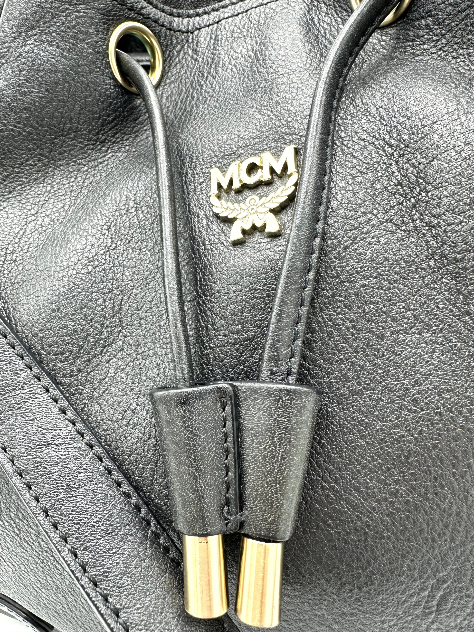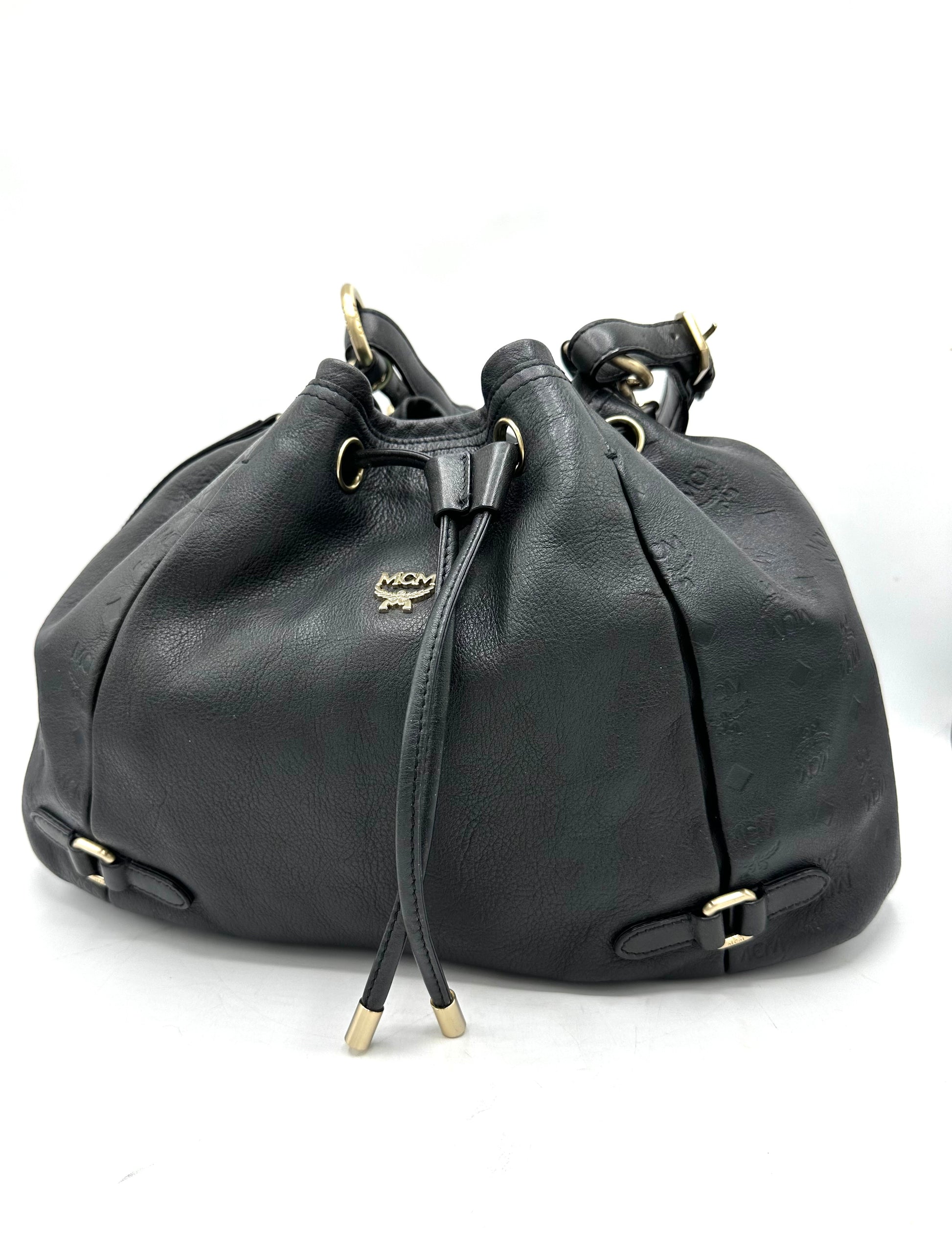 Leather drawstring buckets from MCM are less commonly found than coated-canvas monogram versions, making this variant more collectible. The dark-gray color is versatile and modern, perfect for someone who wants luxe without loudness.