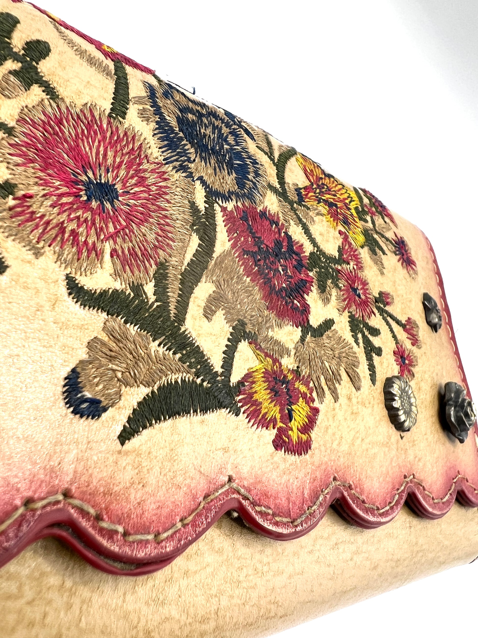 Color: Prairie Rose floral on neutral background Material: Leather (hand-stitched, embroidered detail)