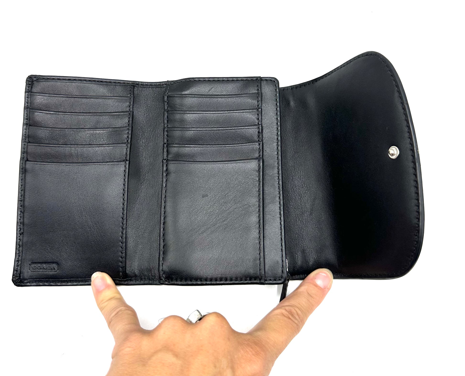 Sleek, compact, and iconic — this tri-fold wallet blends the timeless Coach signature C pattern in chic black and gray tones with durable leather trim. It’s stylish enough to stand alone yet small enough to slip inside your favorite bag.
