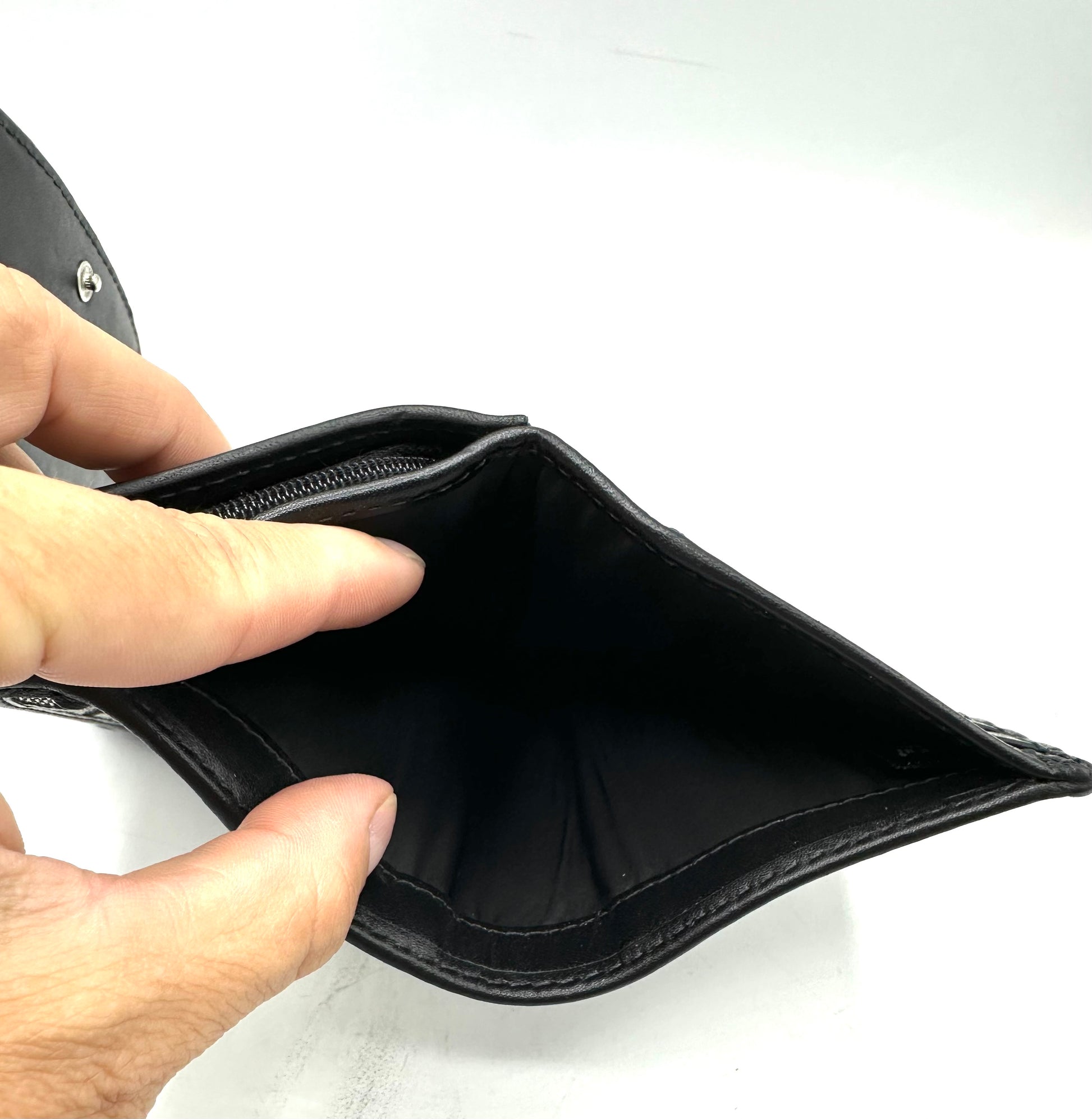 Interior: Fabric and leather lining with card slots and bill compartment